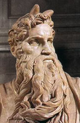 Så här ligger det till: När Moses i 2 Mos 34:29 kom ner för Sinai så strålade, enl. texten, återigen hans ansikte, qaran or fanaw. Ordet qrn (hebreiska skrivs som regel utan vokaler) kan läsas som verbet "stråla", qaran, men även substantivet "horn", qärän. Trots att den senare läsningen ger ogrammatisk hebreiska så är det nog därför det i den officiella latinska översättningen, Vulgatan kallad, står cornuta, "behornad". Attributet togs upp i konsten (där man haft svårt nog att porträttera alla patriarker, apostlar och helgon så att man enkelt ser vem det är frågan om - jfr Johannes) och det är därför det finns en hel del framställningar av en behornad Moses. Doré kör som synes med en sorts kompromiss, även om bruket började försvinna under 1600-talet. Om översättaren Hieronymus hade någon anledning att utrusta Moses med horn (det behövde inte vara fullt så illa som det ser ut idag), såsom en äldre källa, så känner vi inte till den. Relaterat: Tio Guds bud Referenser: